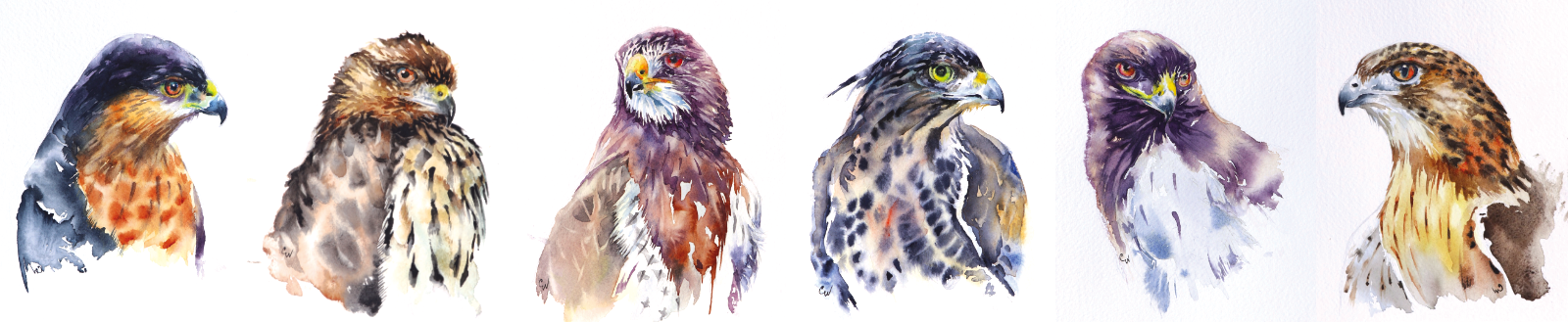 A series of 7 hawk portraits portrayed in watercolour.